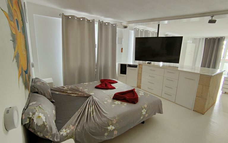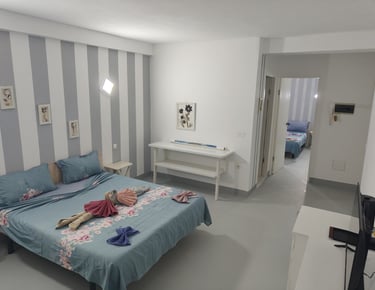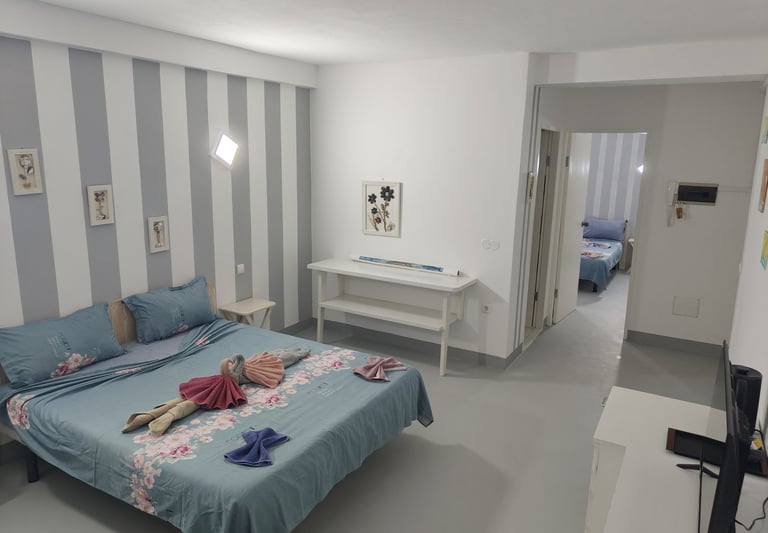 Spacious family room with two double bedrooms, a bathroom with shower, a terrace, two Smart TVs, and air conditioning, ideal for up to 4 people.