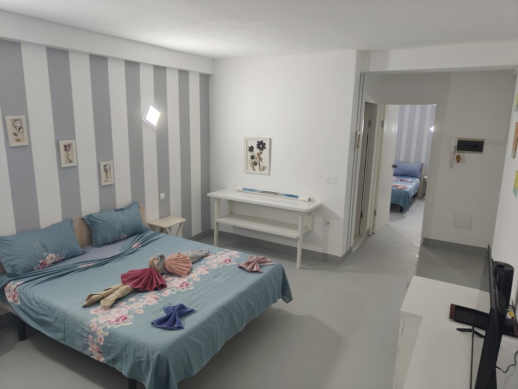 Spacieuse chambre familiale avec deux chambres doubles, une salle de bain avec douche, une terrasse, deux Smart TV et la climatisation, idéale pour 4 personnes maximum.